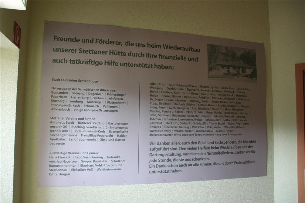 Durch einen tragischen Unfall haben wir, die Ortsgruppe Stetten Fildern am 16. November 2009 über 37 Jahre Vereinsgeschichte verloren. Unersetzliche ideelle Werte, wie Kunstwerke unserer Vereinsmitglieder, Andenken, Urkunden und Auszeichnungen sowie der komplette Aktenbestand der Ortsgruppe wurden samt der Innenausstattung unseres Wanderheims in eine 20cm hohe Brandschuttschicht verwandelt.